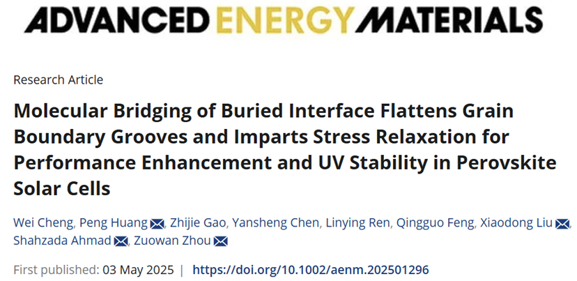 周祚万教授指导的博士研究生程伟同学在钙钛矿太阳能电池埋底界面调控方面的研究取得重要进展,相关研究成果以“Molecular Bridging of Buried Interface Flattens Grain Boundary Grooves and Imparts Stress Relaxation for Performance Enhancement and UV Stability in Perovskite Solar Cell”为题发表在最近出版的国际能源材料顶刊《Advanced Energy Materials》上。程伟为第一作者,含羞草