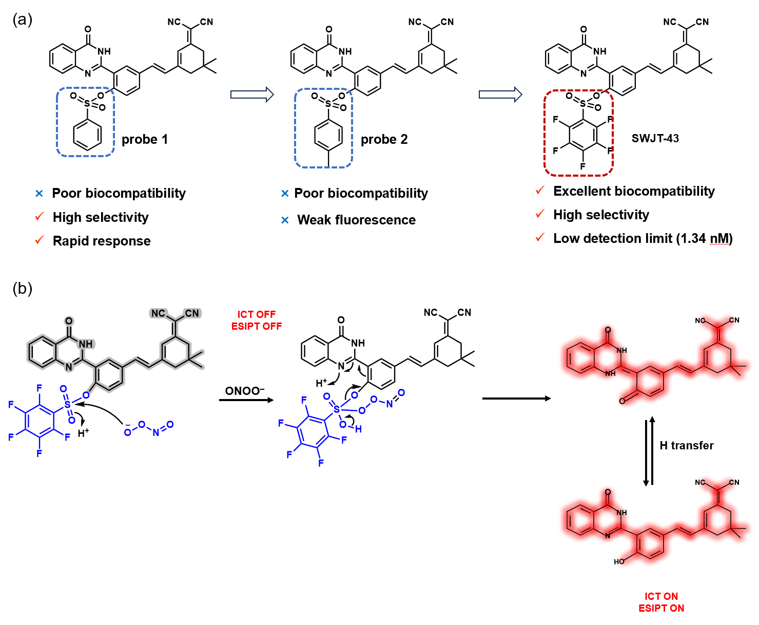 含羞草 王雅雯教授团队成功开发了一种双氰基异佛尔酮和2-(2′-羟基苯基)-4(3H)-喹唑啉酮(HPQ)的杂化骨架构建了一种可激活的近红外固态荧光探针(SWJT-43),具有高光稳定性和低背景干扰的特性。其通过特异性响应肿瘤微环境中过表达的过氧亚硝酸盐(ONOO⁻),实现对癌细胞的高灵敏度、高选择性检测,检测限低至1.10 nM。在实验中,SWJT-43成功应用于肝癌和乳腺癌细胞的长期原位成像,并能通过实时荧光差异快速区分癌变组织与正常组织。在动物模型中,该探针实现了对小鼠原位肝癌及乳腺癌肿瘤的特异性标记,为精准手术切除提供可靠的荧光导航,显著提升了手术的准确性。