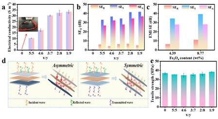 图3. (a)不同x:y比值的Gx/DF4.39/Gy-5.61复合薄膜的体积电导率;(b)比较了Gx/DF4.39/Gy-5.61复合薄膜的平均EMI SE;(c)不同Fe3O4含量的G3/DF4.39/G7-5.61复合薄膜的平均EMI SE;(d) Gx/DF4.39/Gy复合薄膜EMI屏蔽机制示意图;(e)不同x:y比值下Gx/DF4.39/Gy-5.61复合薄膜的拉伸强度