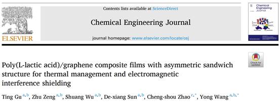 综上,本研究以可再生PLLA作为聚合物基体,通过合理设计填料的非对称分布和引入少量磁性粒子,实现了导热性能和低反射电磁屏蔽性能的同步提升,并且保持了PLA基复合薄膜良好的机械性能。这一研究结果为制备兼具高导热性能和电磁屏蔽性能的聚合物基可再生复合薄膜提供了新的方向。相关成果以“Poly(L-lactic acid)/graphene composite films with asymmetric sandwich structure for thermal management and electromagnetic interference shielding”为题发表在Chemical Engineering Journal. DOI: 10.1016/j.cej.2023.143190。论文的第一作者为2019级博士研究生辜婷,通讯作者为含羞草