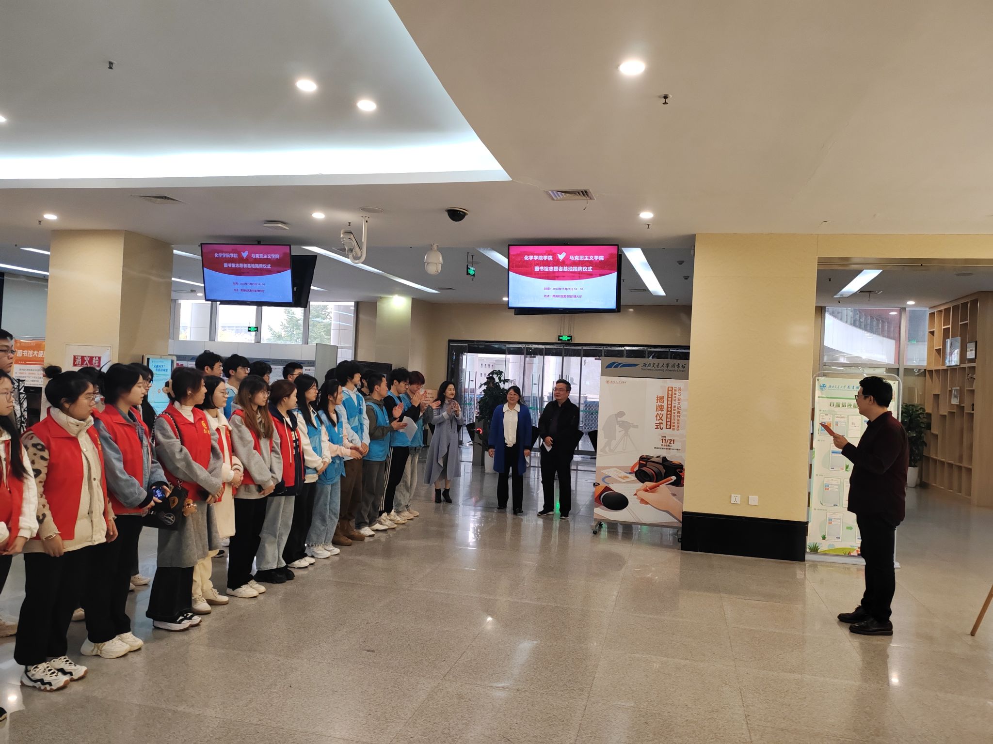 党委副书记张春燕、辅导员何芙馨、魏浩,马克思主义学院团委书记赵晨以及图书馆志愿者基地、学院青年志愿者协会志愿者参加揭牌仪式。揭牌仪式由图书馆犀浦读者服务部副主任王洋主持。