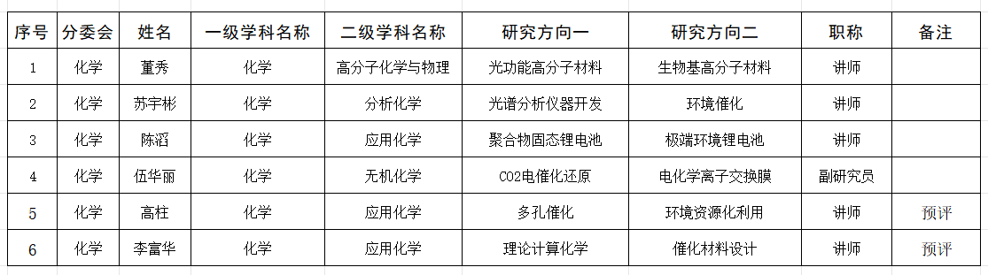 根据研究生院《关于进行2026年新增博士、硕士生指导教师资格遴选工作的通知》要求,经个人申请 、化学学位评定分委会审议通过,2026年拟新增硕士生指导教师名单公示如下: