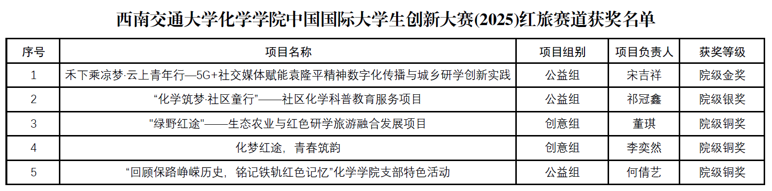 关于启动中国国际大学生创新大赛(2025)“青年红色筑梦之旅”赛道院内选拔赛的通知》,经公开报名、合题性审核、规范性评审,共确定5支院级获奖队伍(其中金奖推荐参加校级选拔赛),现将名单予以公示。