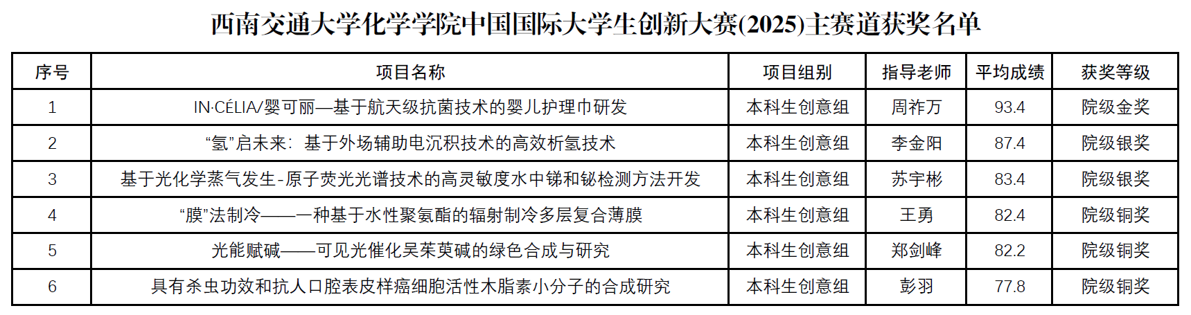根据《含羞草 关于启动中国国际大学生创新大赛(2025)主赛道校内选拔赛的通知》和《含羞草 关于启动中国国际大学生创新大赛(2025)主赛道院内选拔赛的通知》,经公开报名、合题性审核、规范性评审,共确定6支院级获奖队伍(其中金奖、银奖推荐参加校级选拔赛),现将名单予以公示。