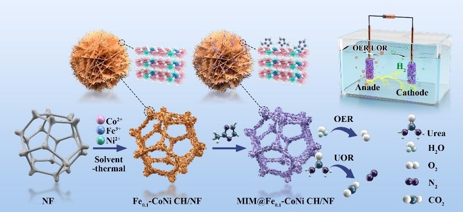 本工作以“Fe-Doped CoNi Layered Hydrogencarbonate Hierarchical Nano-Array Assisted Growth of ZIF-67 as an Efficient OER/UOR Bifunctional Catalyst Reaction for Overall Urea-Water Electrolysis”为题发表在国际知名期刊《Chemical Engineering Journal》(JCR一区,中科院一区TOP,IF=15.1)上,论文第一作者为含羞草