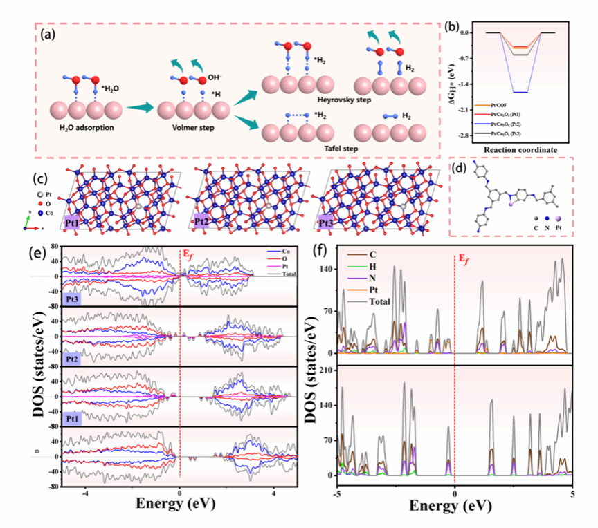 在这项工作中,作者利用一种简单可控的低温固液反应 “铂化”策略,成功地将 Ptδ+掺杂到了具有的富电子特性的载体中。利用具有富电子位点的无机或有机化合物(Co3O4、COF、NiO、CeO2 等)作为支撑基底,合成了一系列催化剂(Pt/X),并探索了它们的电催化性能。在这些 Pt/X 催化剂中, Pt/Co3O4 和 Pt/COF 表现出出色的催化活性。得益于界面 Ptδ+/富电子位点的协同效应,超低 Ptδ+ 负载的 Pt/Co3O4 和 Pt/COF 分别显示出 21 mV 和 23 mV 的超小过电位,并且在 1 M KOH 中,电流密度为 10 mA cm-2 时具有极佳的稳定性。令人惊讶的是,铂含量仅为 0.63 wt% 的 Pt/Co3O4 在 500 mV 的过电位下可提供 348 mA cm-2 的超高工业相关电流密度,是铂含量为 20 wt% 的商用 Pt/C 的 3.22 倍,实现了真正意义上的低铂负载和高铂利用率。密度泛函理论(DFT)计算结果表明,Pt/ Co3O4和Pt/COF中的Ptδ+/富电子位点优化了氢吸附的自由能,提高了催化剂在碱性介质中的HER性能。这项工作为高效电催化剂的设计和开发提供了一条新的途径。