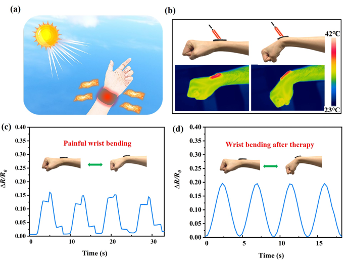 图5. (a) PAM/SSD/P@M凝胶光热治疗示意图。(b) 志愿者手腕受伤前和热疗后的照片和红外热图像以及(c,d)相应的传感性能。