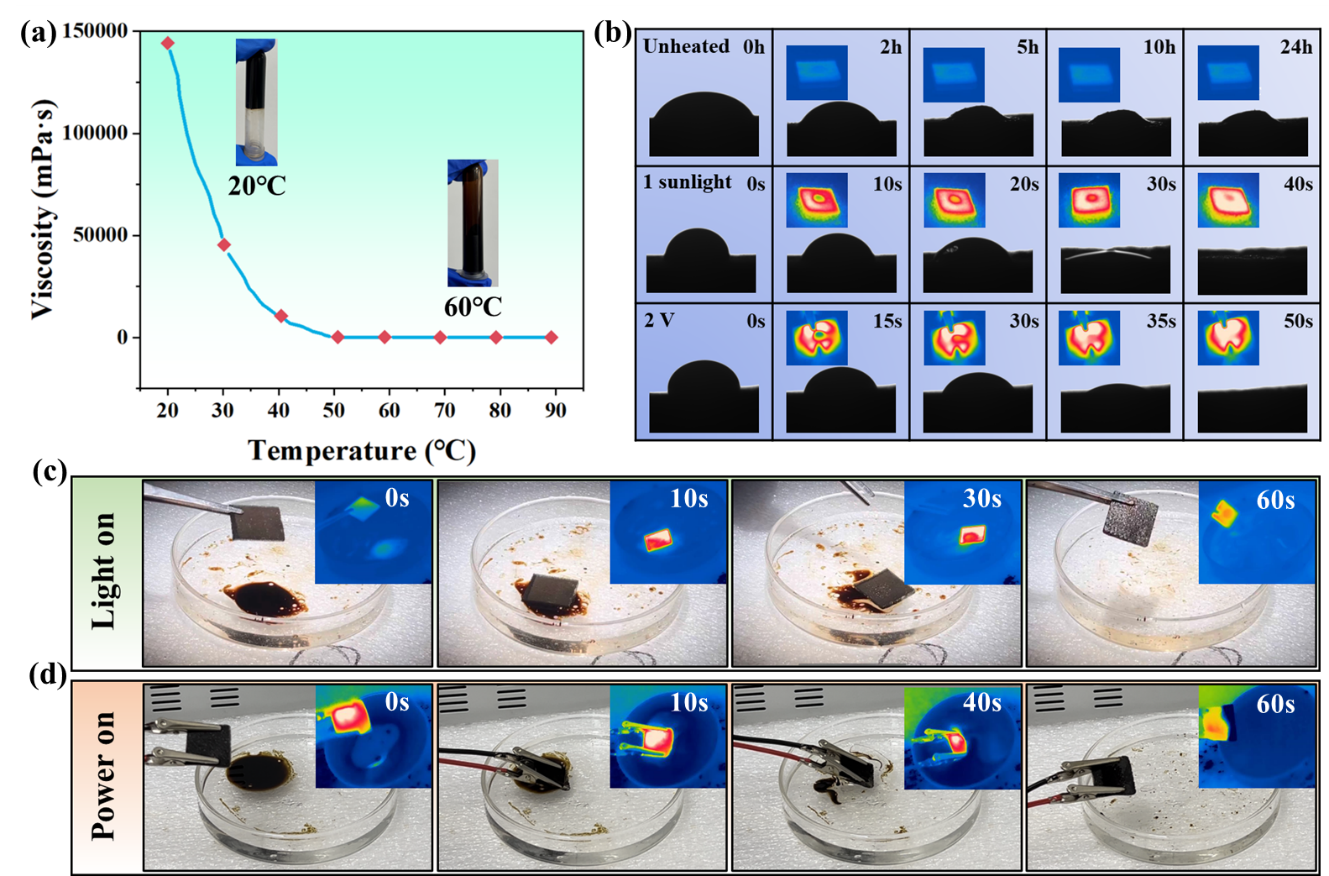 图7. (a)温度对高粘度原油粘度的影响。(b)在未加热、模拟光照(1 sun)和通电(2 V)条件下,原油在MF@PPy/PDMS泡沫表面的渗透行为及其热红外热成像图。(c)模拟光照(1 sun)和(d)2 V电压下原油的吸附行为的图片。