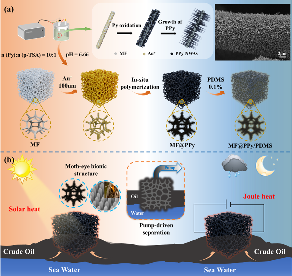 图1. (a)制备MF@PPy/PDMS泡沫的示意图。(b)蛾眼结构的MF@PPy/PDMS泡沫用于全天候原油清理的示意图