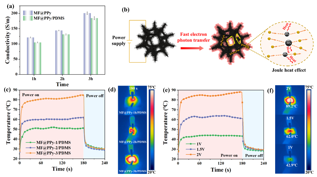 图5. MF@PPy/PDMS的电热转换性能。(a)不同聚合时间下MF@PPy和MF@PPy/PDMS泡沫的电导率。(b)泡沫内部电子传输路径的示意图。(c, d) MF@PPy/PDMS在2V电压下的时间-温度曲线图及热成像照片。(e, f) MF@PPy-3/PDMS在不同输入电压(1、1.5和2V)下的时间-温度曲线图及热成像照片。