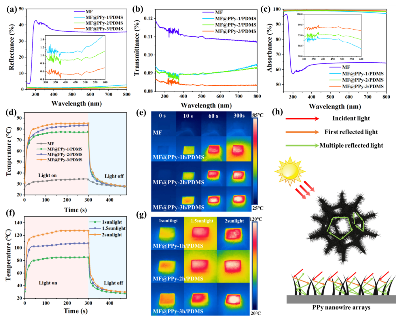 图4. MF@PPy/PDMS的光热转换性能。(a) MF和MF@PPy/PDMS泡沫的反射率,(b)透射率,(c)吸收率。(d, e) MF和MF@PPy/PDMS泡沫在模拟1个太阳光照下的时间-温度曲线图及对应的热成像照片。(f, g) MF@PPy-3/PDMS在不同模拟太阳光照强度(1、1.5和2 sun)下的时间-温度曲线图及对应的热成像照片。(h) MF@PPy泡沫中光传播路径的示意图。三维微通道和一维PPy NWAs使光在泡沫中多次反射,从而减少透射并增强光吸收。