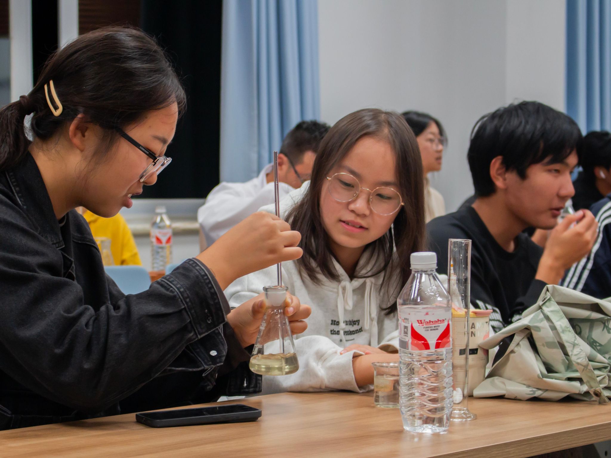 学生会的工作人员们准备了“变色瓶制作”的趣味小实验,同学们在实验中,不仅锻炼了称量、配置溶液等实验操作动手能力,更增强了对化学的热情与兴趣!活动结尾的科普视频也给同学们留下了深刻的印象:三镜反应、结晶析出、络合变色……每一次的原子碰撞都擦出了不一样的火花,每一次的分子改变构成了我们这个绚丽多彩的世界!