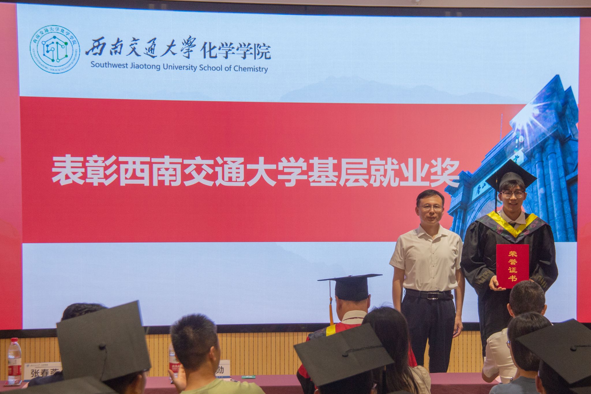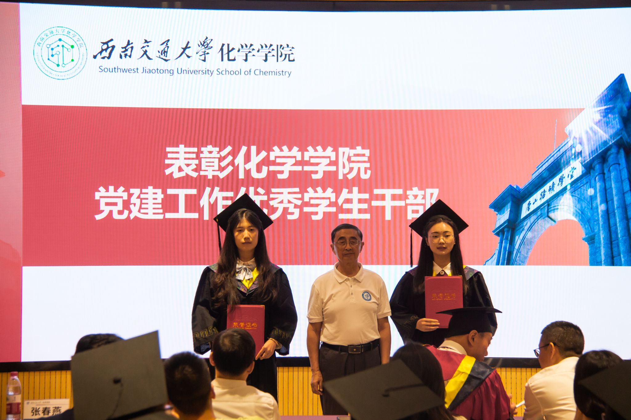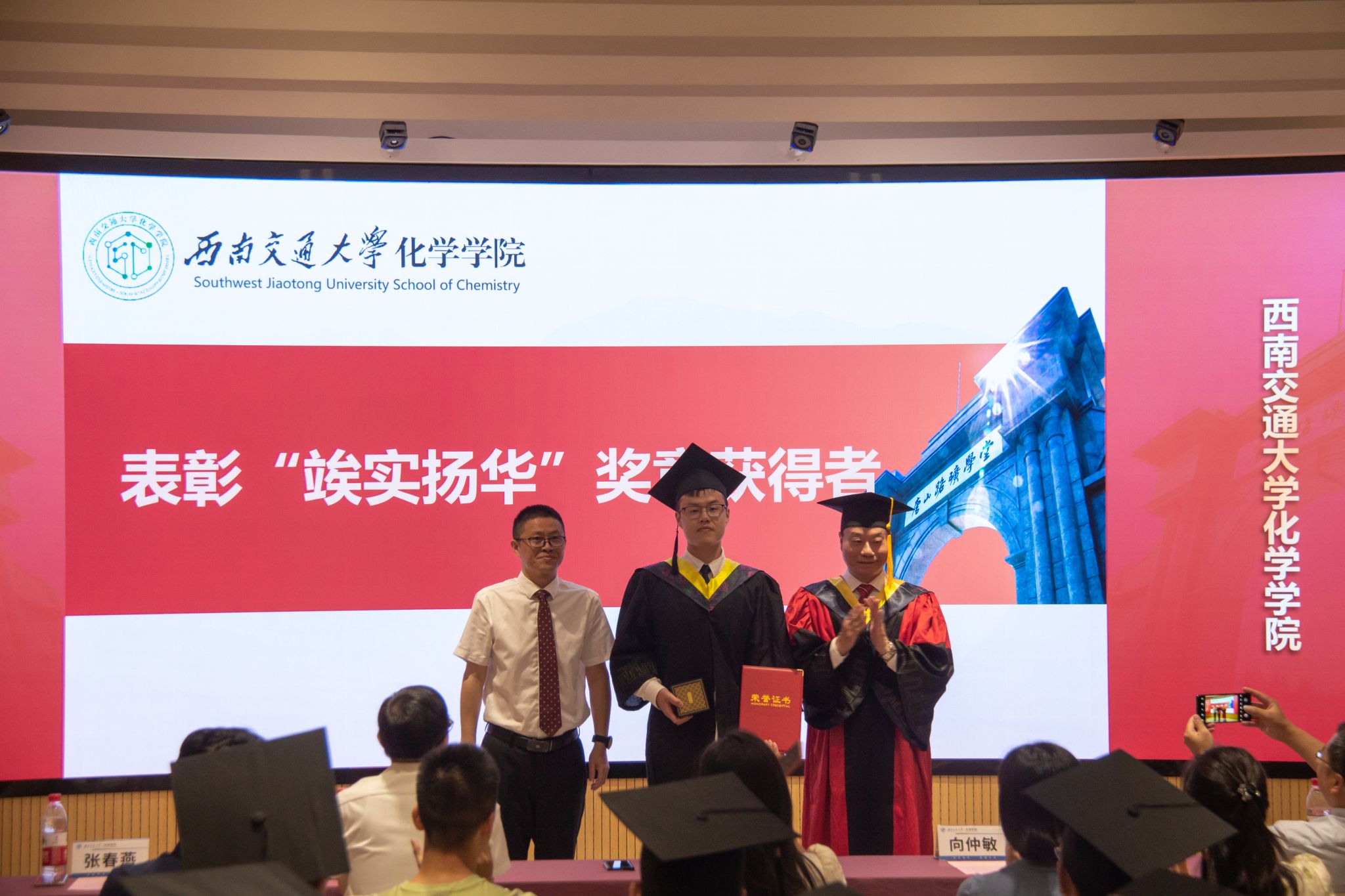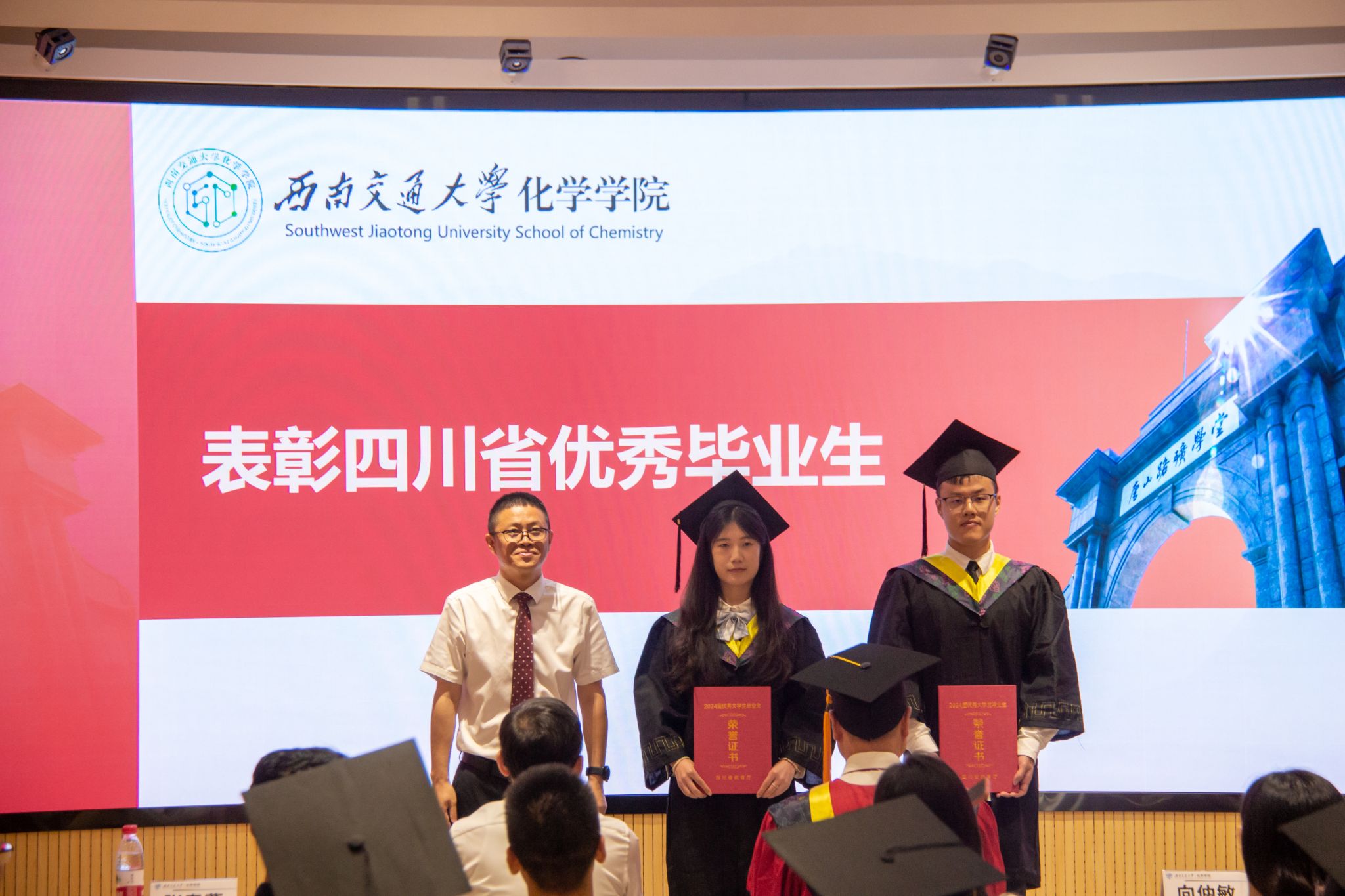 向仲敏书记为四川省优秀毕业生颁奖。向仲敏书记、周祚万院长为学校“竢实扬华”奖章获得者汪奕帆同学颁奖。