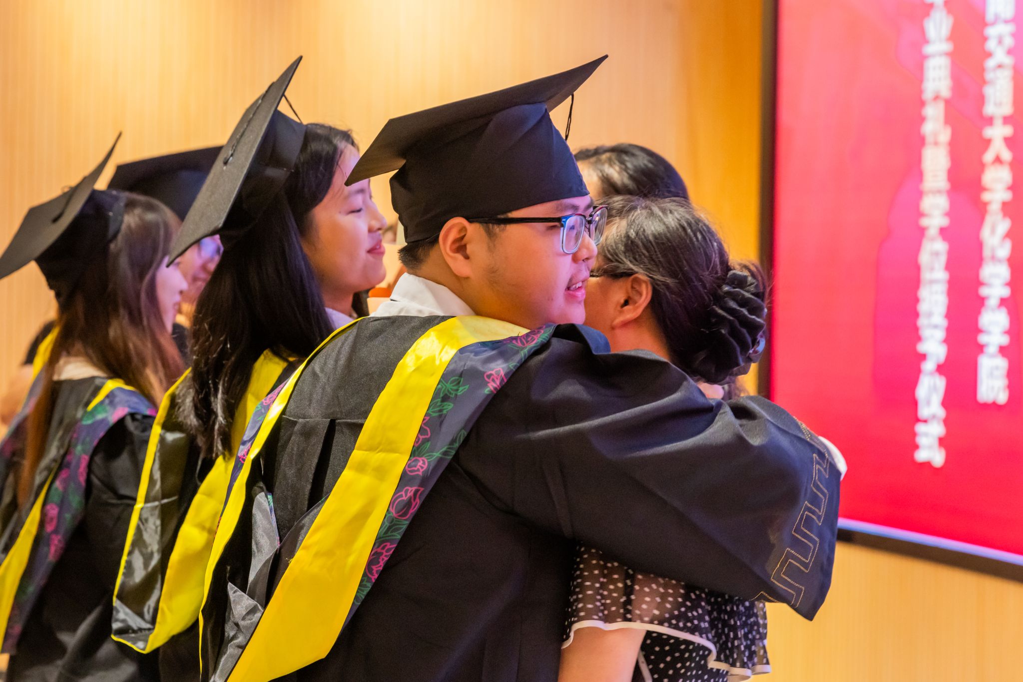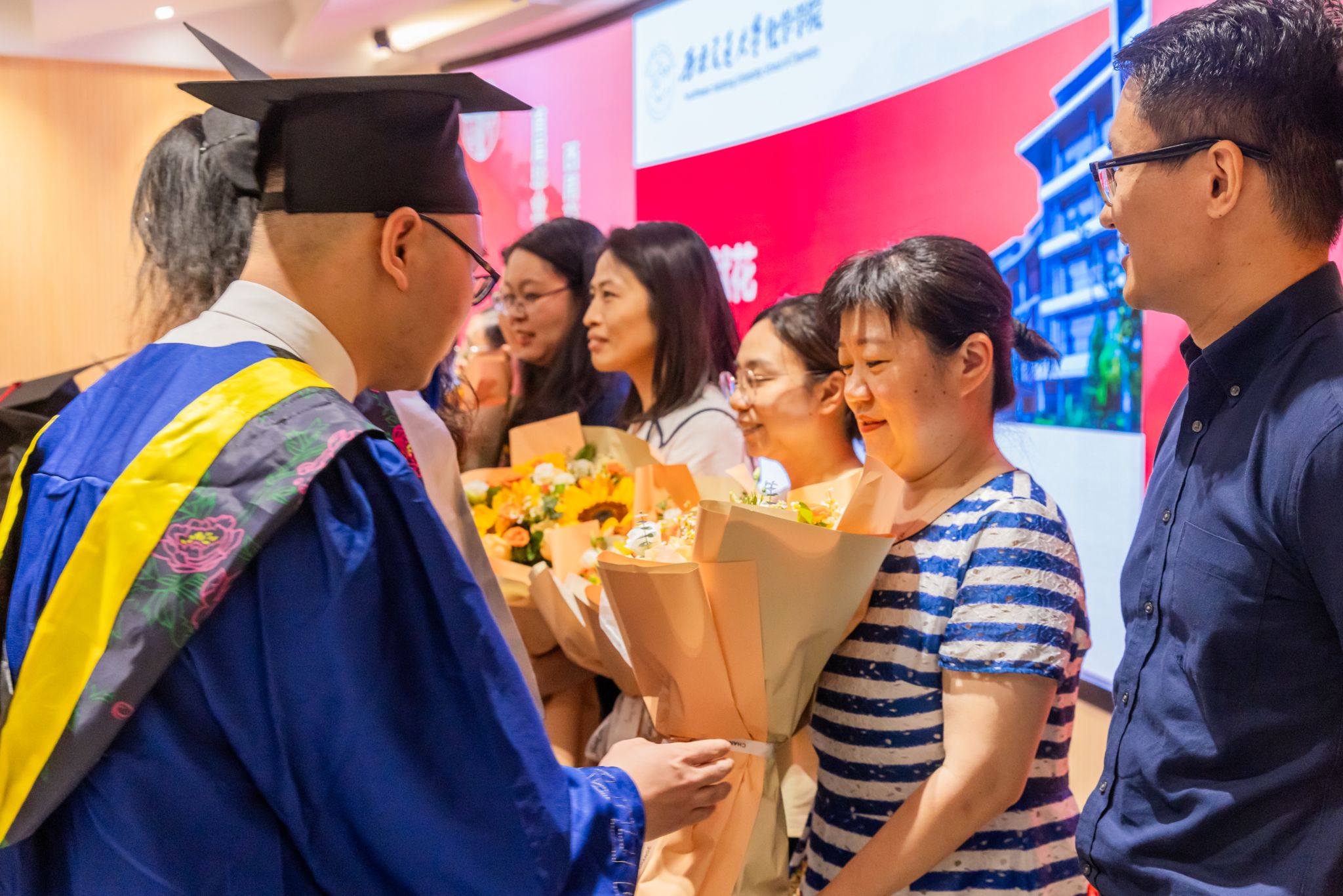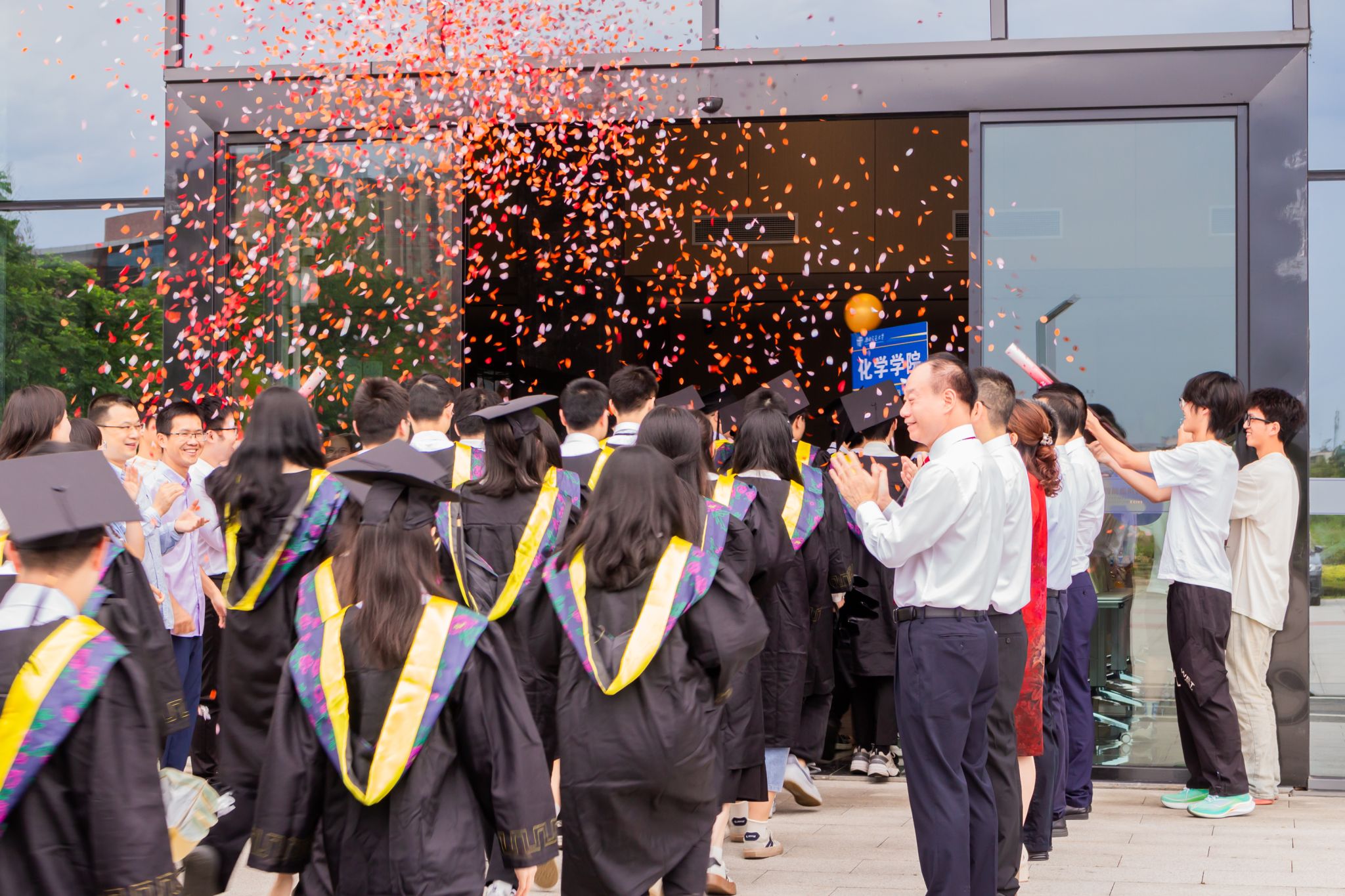 典礼开始前,学院全体党政领导、教师、家长以及学弟学妹们在入口处欢迎毕业生们入场。