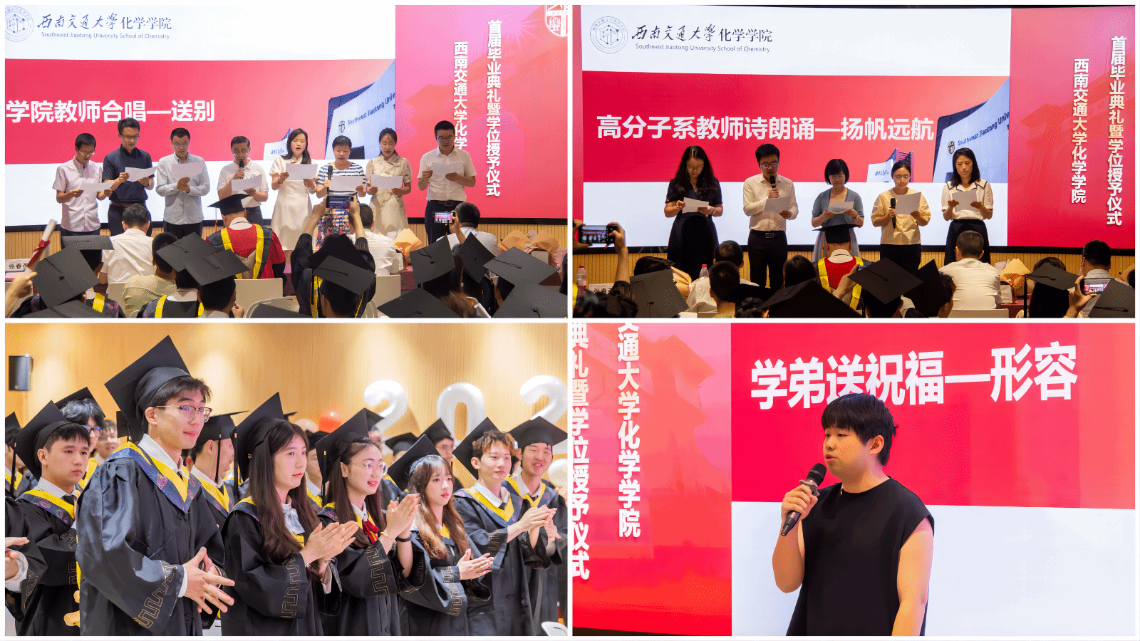学院举办的不仅是毕业典礼,更是为同学们送上的“祝福礼”“启程礼”。在典礼接近尾声之际,高分子系教师为同学们原创了诗朗诵《扬帆远航》;2021级本科生王浩宇同学为学长学姐们送上歌曲《形容》;最后,管棣老师带领学院全体教师与全体毕业生一起合唱《送别》。